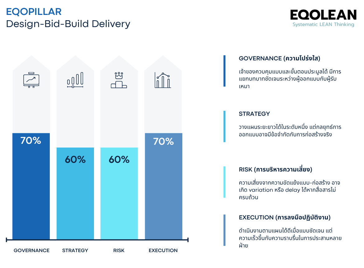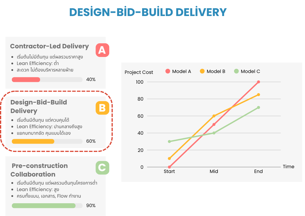 Design-Bid-Build เหมาะกับเจ้าของที่ต้องการคุมคุณภาพและขั้นตอนการประมูล แต่ถ้าโครงการมีความซับซ้อน หรือเป้าหมายเรื่องความ Lean ชัดเจน การเตรียมข้อมูลและการประสานงานล่วงหน้าจะมีผลอย่างมากต่อประสิทธิภาพของโมเดลนี้